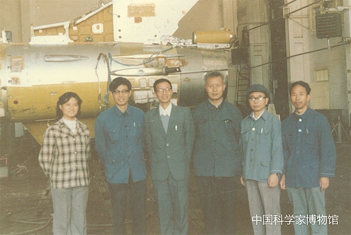 曹春晓(左三)在装上TC11钛合金伞舱梁的歼教7飞机前合影