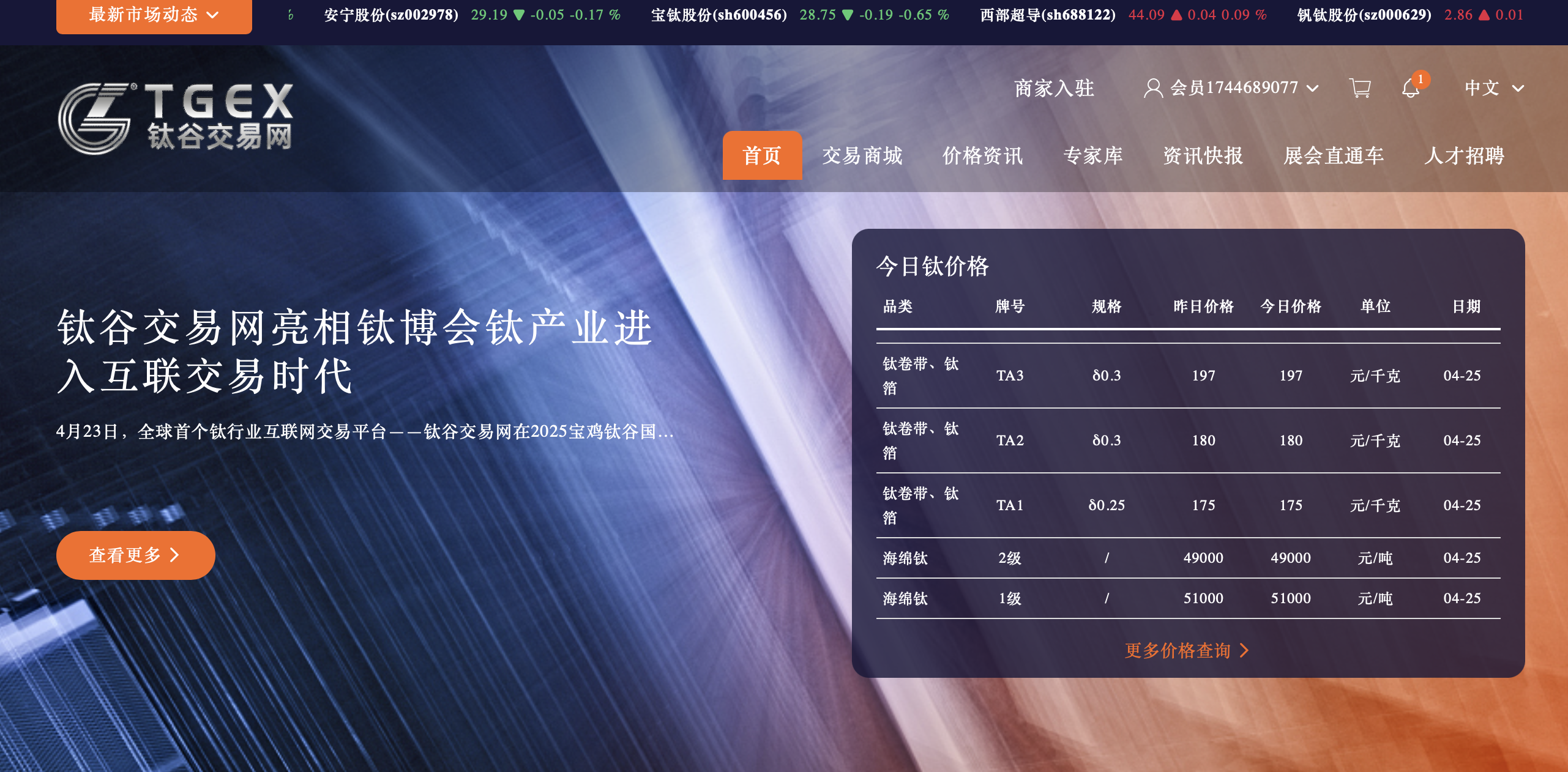 据悉,平台已打造由宝钛集团、陕西钛谷集团、新疆湘润、云南国钛、洛阳双瑞等龙头企业领衔的产业生态圈,共享技术研发与市场开拓资源;与多家国有银行签署百亿专项供应链金融授信;与中国物流与中国邮政两大央企共同打造专属运输链;组建近百位院士专家智库为入驻企业提供产线技术支持。预计2025年实现注册会员1万+,平台交易额突破10个亿。