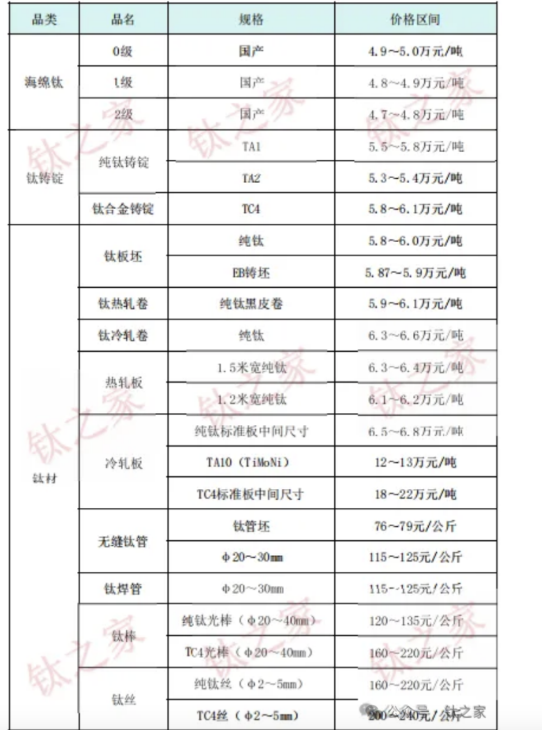 注:以上价格由【钛之家】收集整理,并不代表企业间的最终成交价格,仅用于行业参考。如为此发生争议,【钛之家】不承担相关责任。