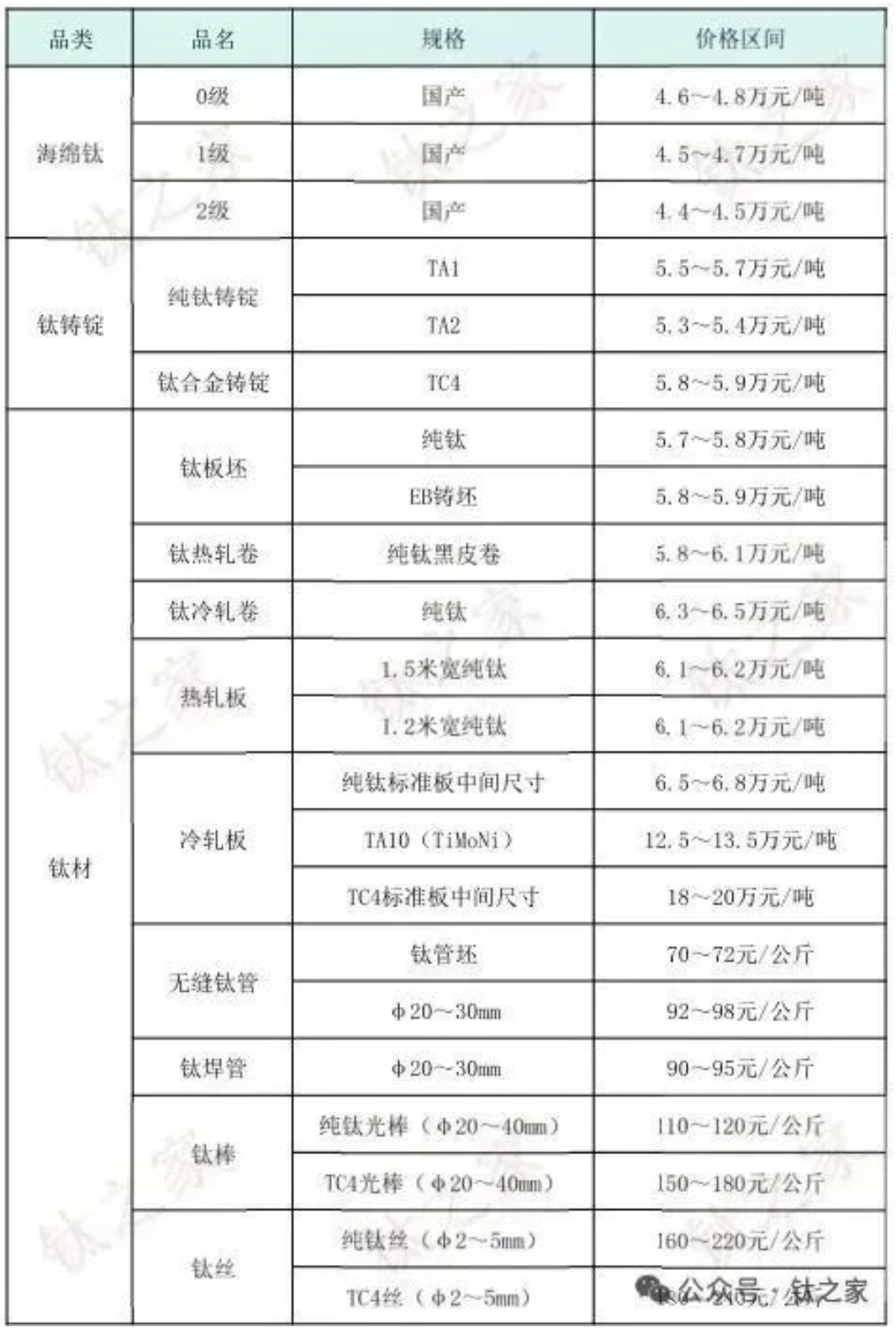 注:以上价格由【钛之家】收集整理,并不代表企业间的最终成交价格,仅用于行业参考。如为此发生争议,【钛之家】不承担相关责任。